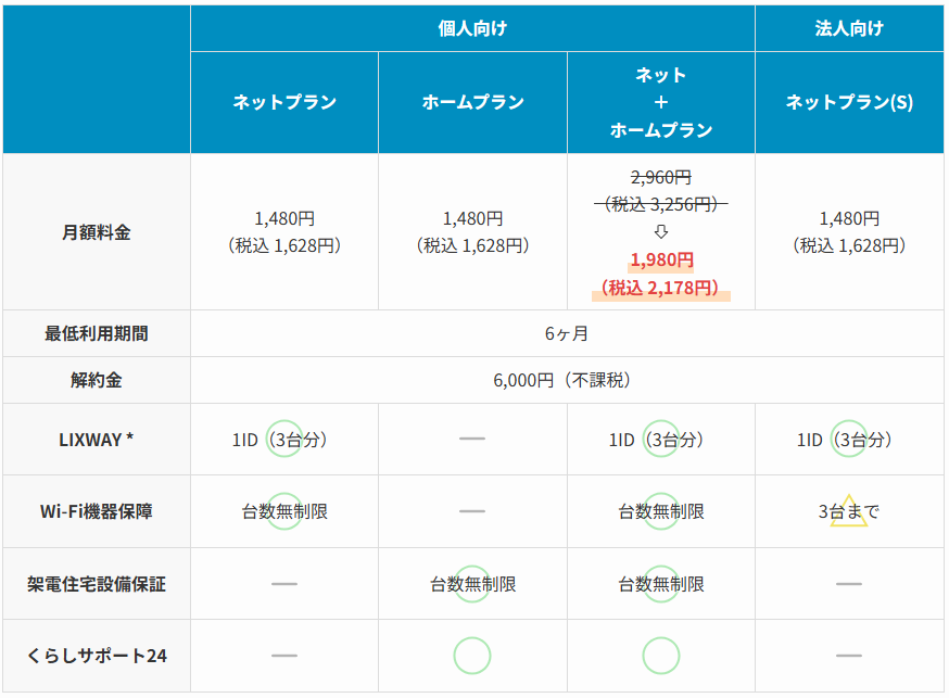 | ネットプラン | ホームプラン | ネット + ホームプラン | ネットプラン(S) | |